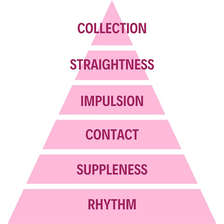 The six elements of the training scale interact with and depend on one another — they don’t work alone. It helps if you visualise the scale as a pyramid, with each layer representing one scale.